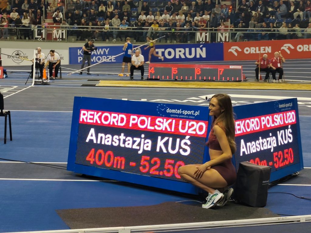 Podczas zakończonych w niedzielę 70. PZLA Halowych Mistrzostw Polski Anastazja Kuś poprawiła należący od pięciu lat do Kornelii Lesiewicz halowy rekord kraju U-20 w biegu na 400 metrów. Od teraz wynosi on 52,5 sekundy. Reprezentantka klubu AZS UWM Olsztyn w finałowym biegu finiszowała na czwartej pozycji i tym startem prawdopodobnie zapewniła sobie miejsce w sztafecie na tegoroczne halowe mistrzostwa świata, które w dniach 20-22 marca odbędą się w Toruniu.