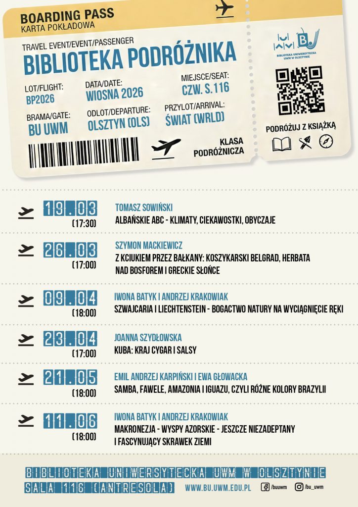 Plan spotkań cyklu Biblioteka Podróżnika wiosną 2026 roku: