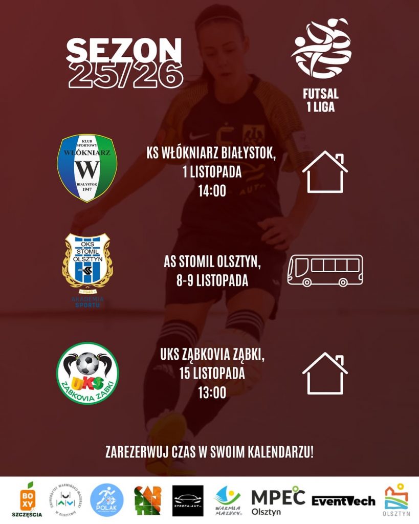 Sezon 2025/2026 w I lidze futsalu kobiet „Szpilki” zainaugurują w sobotę 1 listopada. W małej arenie Hali Urania zmierzą się z Włókniarzem Białystok. Początek spotkania o 14:00! Wstęp wolny. W listopadzie kortowskie futsalistki rozegrają jeszcze dwa kolejne mecze – w tym derbowe spotkanie z AS Stomil Olsztyn.