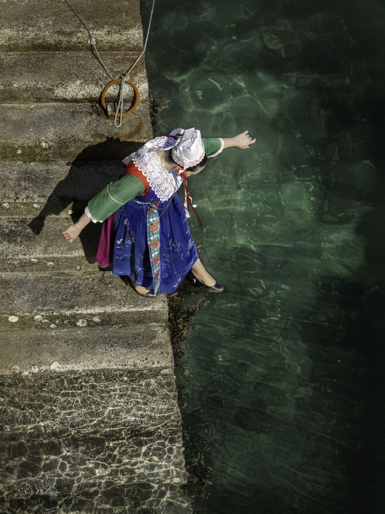 Zbliżenia portretowe pozwalają dostrzec subtelne detale rękodzieła, ale to w dynamicznych kadrach strój bretoński nabiera pełni życia. Wirujące w tańcu koronki, ruch tkanin i intensywne barwy stają się dla fotografa punktem wyjścia do formalnych i kolorystycznych poszukiwań. Jednocześnie pozostają żywym nośnikiem pamięci i tożsamości regionu.