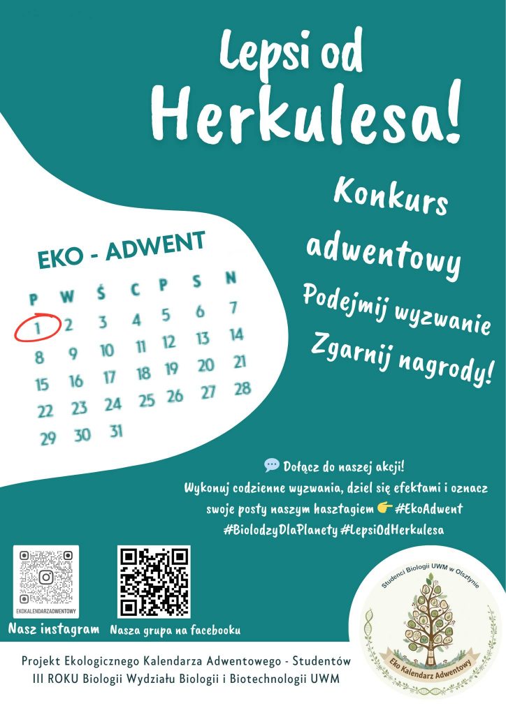 Studenci trzeciego roku biologii na UWM w Olsztynie od 1 do 24 grudnia wykonają 24 drobnych aktywności pod nazwą Eko Kalendarz Adwentowy. Czekoladki zamieniają na… ekologiczne wyzwania. Codziennie w mediach społecznościowych (na Facebooku, Instagramie i TikToku) będą ogłaszać jedno proste zadanie do wykonania w ramach swojej akcji. Każdy może do niej dołączyć i wykonać codzienne wyzwania, udokumentować je zdjęciem, opisem lub krótką rolką i zawalczyć o nagrody.
