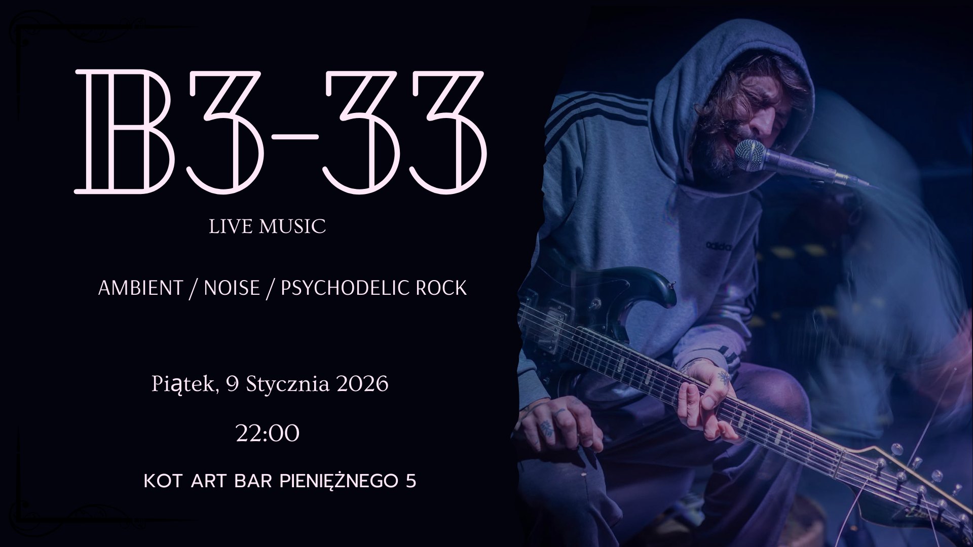 Za warstwę dźwiękową odpowie B3-33 – solowy projekt Bartosza „Boro” Borowskiego. Gitara, głos, bas, djembe, loopy i improwizacja krążąca wokół ambientu, noise’u i psychodelicznego rocka. Muzyka tworzona tu i teraz, reagująca na obraz, napięcie i ciszę. Boro zagrał setki koncertów w całej Europie – od wielkich festiwali po najmniejsze spelunki. Granie do filmów to jego naturalne środowisko. Trochę jak karton dla kota – zawsze trafione.