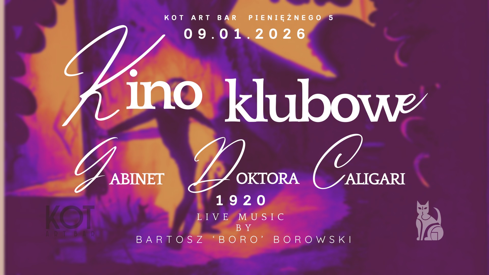 Kot zaprasza do kina. Takiego, gdzie nie chrupie się popcornu zbyt głośno, a dźwięk wchodzi pod skórę. W piątkowy wieczór cofniemy się do mroku niemego kina podczas seansuj „Gabinet doktora Caligari”. Za oprawę dźwiękową prezentowaną na żywo odpowie Bartosz „Boro” Borowski, który jako B3-33 zagra również po projekcji.