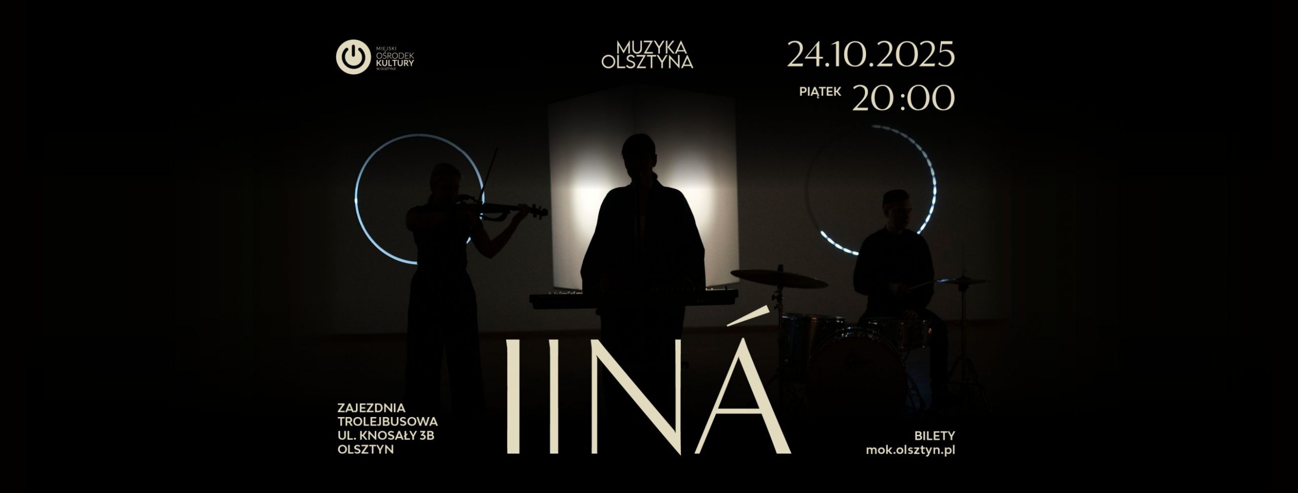 MOK Olsztyn w ramach cyklu Muzyka Olsztyna zaprasza na koncert zespołu IINÁ. To olsztyńskie trio stworzone przez liderkę zespołu, autorkę piosenek oraz wokalistkę i instrumentalistkę EWĘ PAWLAK, skrzypaczkę DOMINIKĘ CIEŚLAK i perkusistę JACKA RUCZKO. Wspólnie aranżują utwory, a na scenie tworzą energiczne i magiczne brzmienie zbliżone do skandynawskiego minimalizmu.