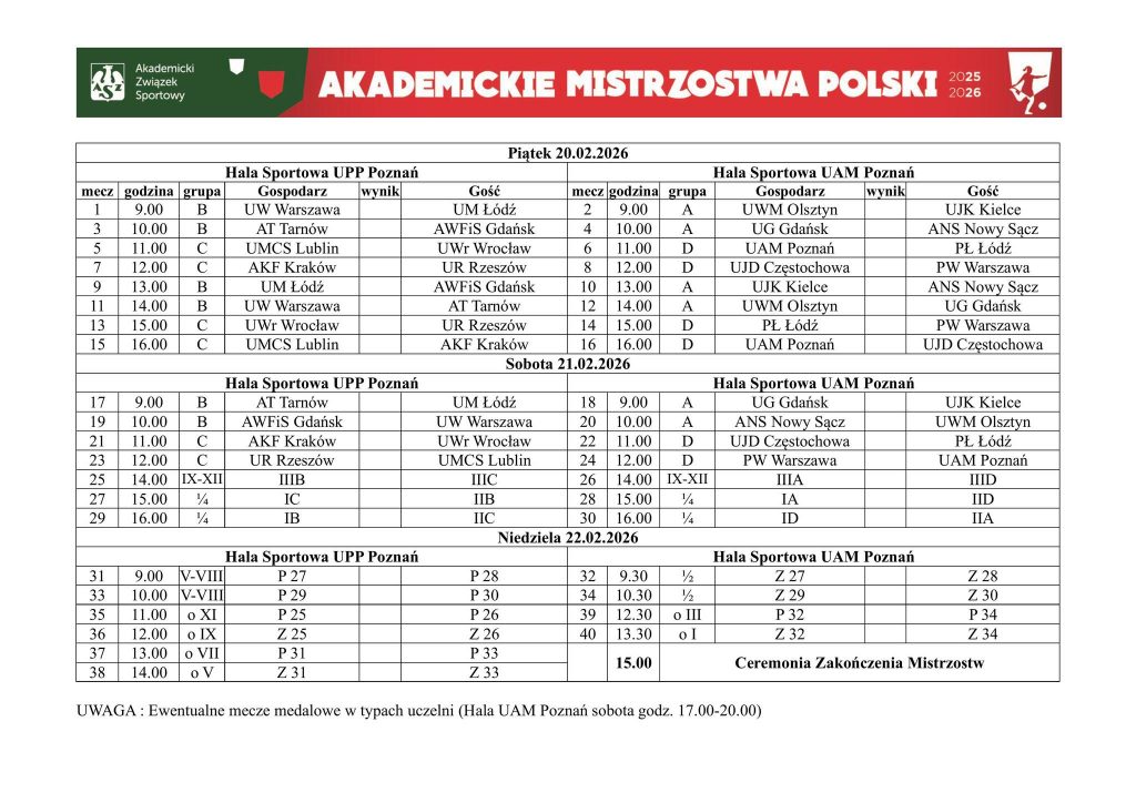20 lutego w Poznaniu studentki Uniwersytetu Warmińsko-Mazurskiego w Olsztynie rozpoczną natomiast rywalizację w finałowym turnieju Akademickich Mistrzostw Polski w futsalu kobiet. W fazie grupowej zmierzą się z Uniwersytetem Jana Kochanowskiego w Kielcach (w piątek o 9:00), Uniwersytetem Gdańskim (w piątek o 14:00) oraz Akademią Nauk Stosowanych w Nowym Sączu (w sobotę o 10:00).