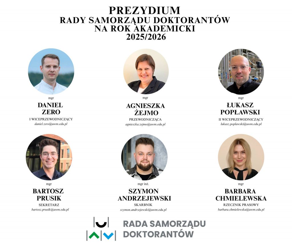 Pełny skład Rady Samorządu Doktorantów na rok akademicki 2025/2026: