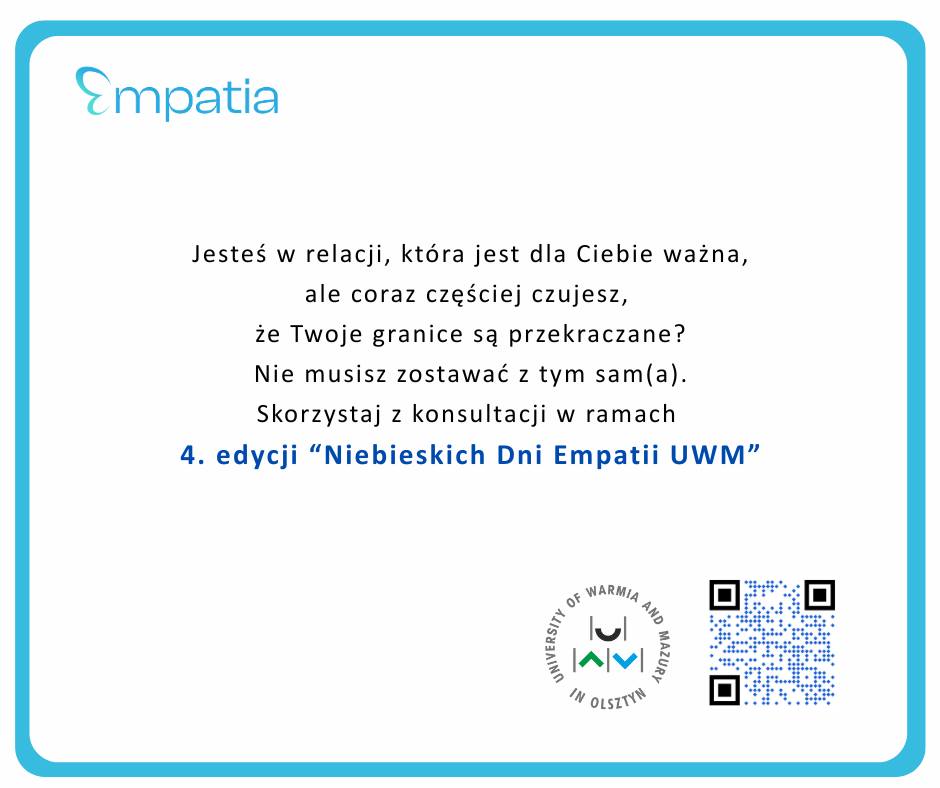 „Niebieskie dni Empatii” to seria bezpłatnych indywidualnych konsultacji dla pracowników i studentów UWM. Dedykowane są przede wszystkim osobom, które w ważnych dla siebie relacjach doświadczyły lub obecnie doświadczają przekraczania granic i czują, że potrzebują na ten temat porozmawiać, uzyskać wsparcie. Jeśli to o Tobie, zgłoś chęć udziału w indywidualnym spotkaniu. Być może też znasz osoby, dla których takie konsultacje mogą okazać się pomocne!