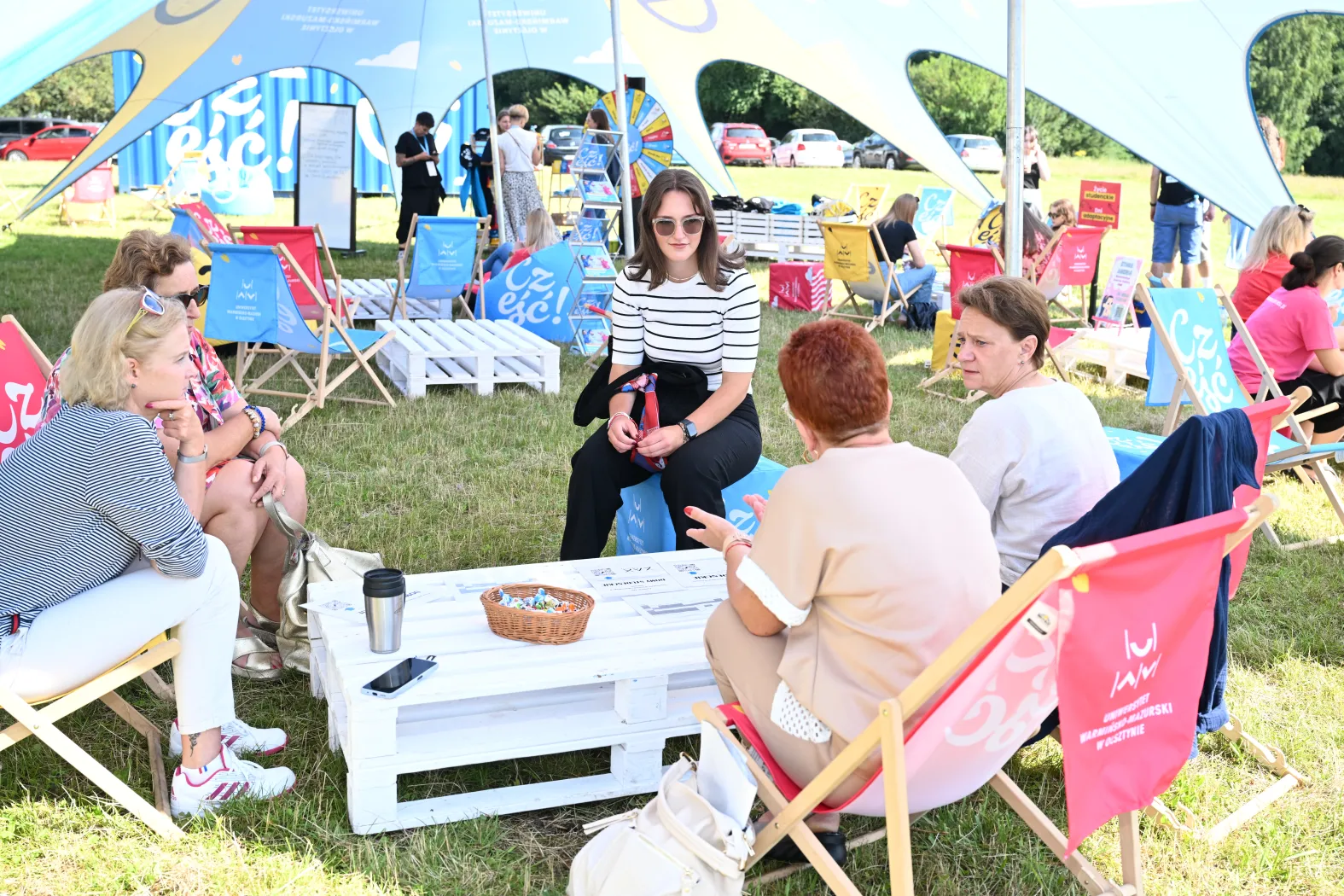 Zapraszamy do strefy, gdzie mamy możliwość chilloutu. Można tu porozmawiać, poznać nowe osoby. Dodatkowo jest koło fortuny i różne gadżety do wygrania – m.in. bluzy, koszulki, wlepki, notesy – rzeczy, które jak najbardziej przydadzą się później na studiach. Też są rozłożone gry wielkoformatowe, w które można pograć i spędzić miło czas. Zapraszamy jeszcze na zdjęcie instaxem, jest piękna ramka, z tyłu zieleń, będziecie mieli pamiątkę!”