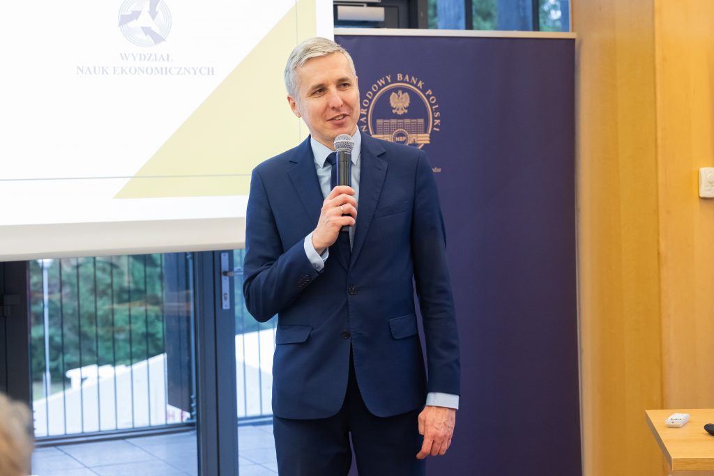 Gości konferencji powitał dr Marek Siemiński, prodziekan ds. studenckich Wydziału Nauk Ekonomicznych. Dziękował za świetną współpracę przedstawicielom Narodowego Banku Polskiego.