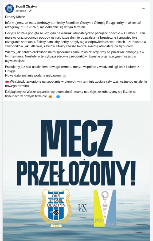 Kolejny sparing Stomil Olsztyn rozegra w sobotę 14 stycznia. Na boisku przy ul. Żytniej zmierzy z się z innym zespołem z pomorskiej IV ligi – Czarnymi Pruszcz Gdański. Początek meczu o 18:30. Tydzień później „Duma Warmii” w 1/8 finału Wojewódzkiego Pucharu Polski na Stadionie Miejskim przy Al. Piłsudskiego miała zagrać się z Olimpią Elbląg. Klub właśnie poinformował, że w tym terminie mecz się nie odbędzie.