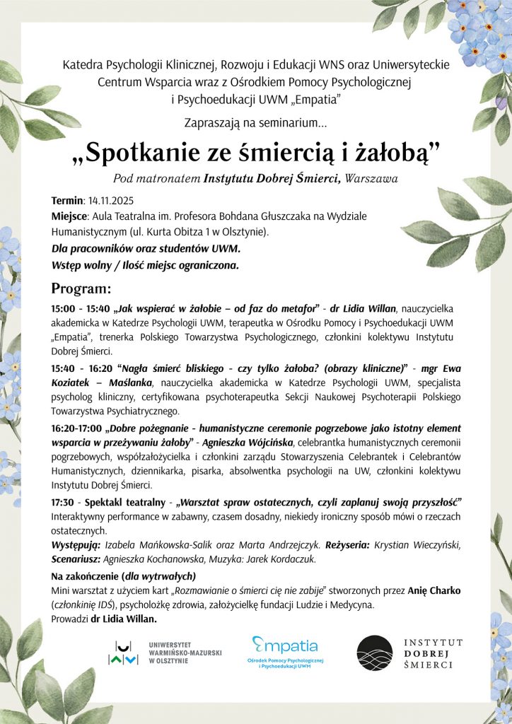 Na stronie Uniwersytetu Warmińsko-Mazurskiego w Olsztynie można znaleźć także rozmowę z jedną z prelegentek seminarium – mgr Ewą Koziatek-Maślanką – o przeżywaniu żałoby. Zachęcamy do lektury!