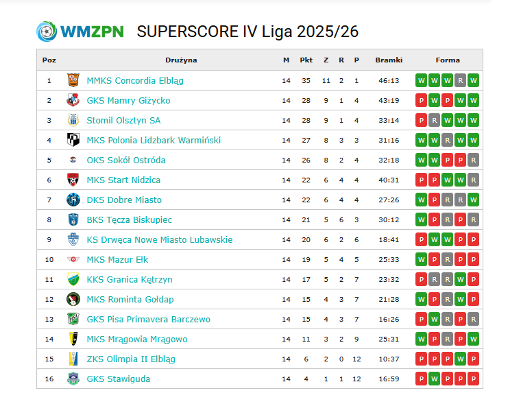 Po czternastu kolejkach sezonu 2025/2026 Stomil Olsztyn zajmuje trzecie miejsce w tabeli Superscore IV ligi. Do liderującej Concordii Elbląg traci siedem punktów. Rundę jesienną zakończy w najbliższą sobotę 15 listopada domowym spotkaniem z Drwęca Nowe Miasto Lubawskie. Początek meczu na Stadionie Miejskim przy Al. Piłsudskiego o godzinie o 12:00.