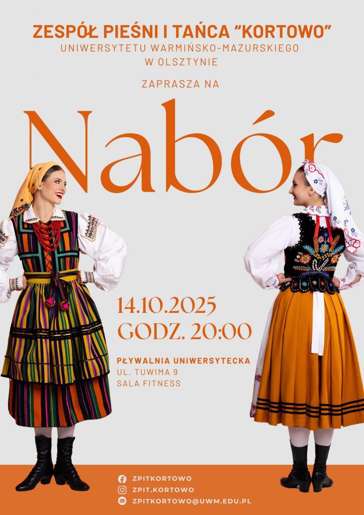 Zespół Pieśni i Tańca „Kortowo” zaprasza na drugi jesienny nabór. W najbliższy czwartek 7 listopada o 20:00 w budynku pływalni uniwersyteckiej przy ul. Tuwima możesz zaprezentować swój talent i w ten sposób rozpocząć niesamowitą przygodę z folklorem! Chcesz nauczyć się tańczyć i śpiewać? A może potrafisz grać na jakimś instrumencie? Jeśli tak, jest to miejsce właśnie dla Ciebie!