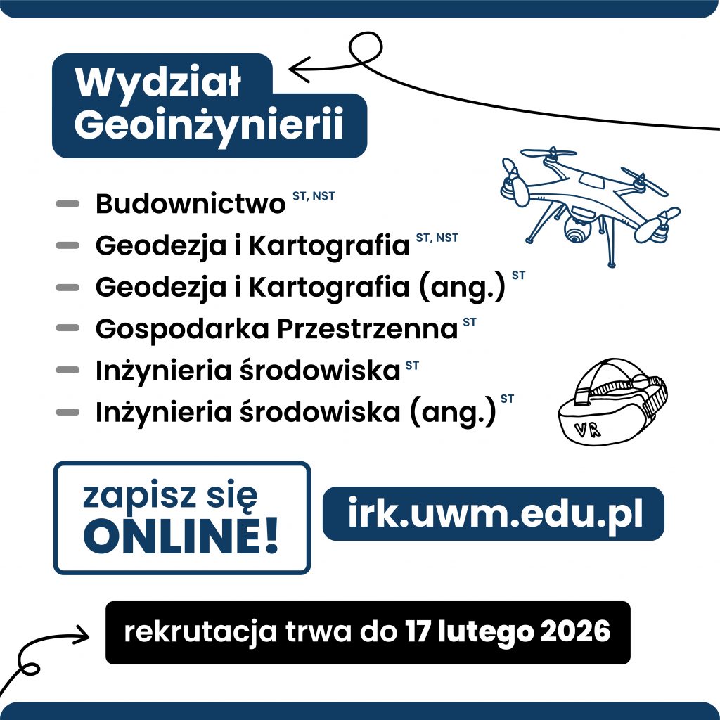 Bogatą ofertę kształcenia dla absolwentów studiów inżynierskich ma także Wydział Geoinżynierii UWM. Obejmuje ona cztery kierunki: budownictwo, geodezja i kartografia, gospodarka przestrzenna oraz inżynieria środowiska.