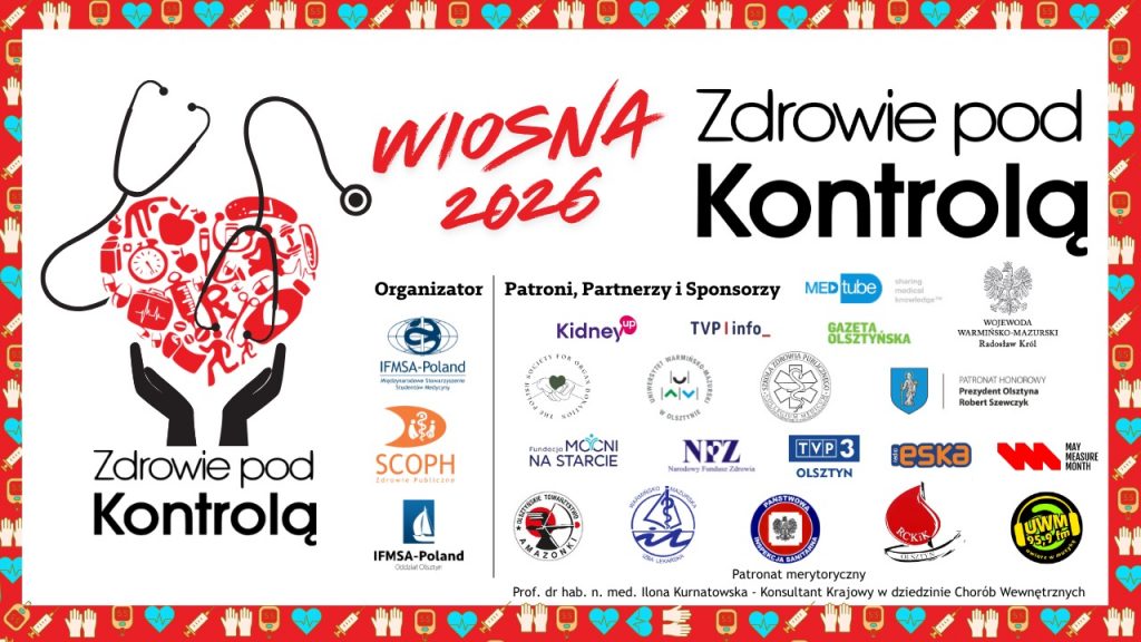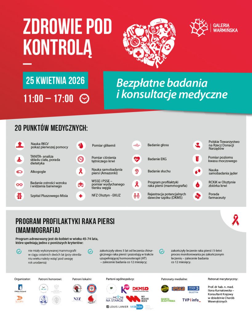 W najbliższą sobotę 25 kwietnia od 11:00 do 17:00 w Galerii Warmińskiej odbędzie się wiosenna odsłona akcji organizowanej przez olsztyński oddział Międzynarodowego Stowarzyszenia Studentów Medycyny IFMSA-Poland. „Zdrowie pod Kontrolą” to szansa skorzystanie z darmowych porad, wykonanie podstawowych badań i konsultacje ze specjalistami.