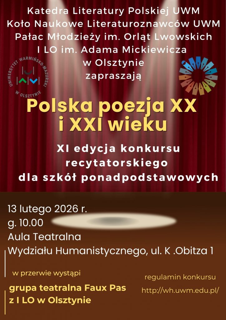 Katedra Literatury Polskiej Uniwersytetu Warmińsko-Mazurskiego w Olsztynie oraz Studenckie Koło Naukowe Literaturoznawców zapraszają do udziału w jedenastej edycji Konkursu Recytatorskiego „Polska poezja XX i XXI wieku”. Zgłoszenia w dwóch kategoriach – recytacja oraz poezja śpiewana – przyjmowane będą do 9 lutego, zaś sam konkurs odbędzie się 13 lutego w Auli Teatralnej na Wydziale Humanistycznym UWM.