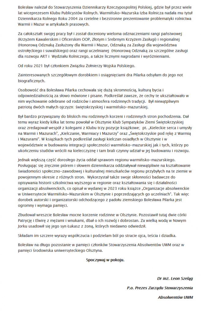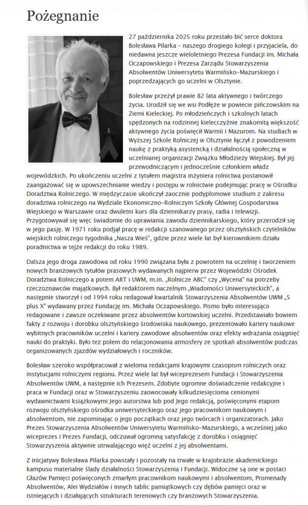 27 października zmarł dr inż. Bolesław Pilarek – wieloletni prezes Zarządu Stowarzyszenia Absolwentów Uniwersytetu Warmińsko-Mazurskiego w Olsztynie, wiceprezes i prezes Fundacji im. Michała Oczapowskiego oraz redaktor naczelny czasopisma „5 plus X”. Miał 81 lat. Uroczystości pogrzebowe odbędą się w piątek 31 października w kościele św. Franciszka z Asyżu w Kortowie.